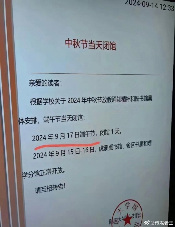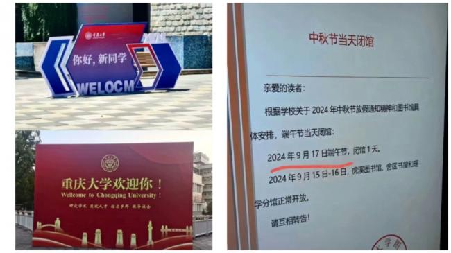 9月16日,大陸微博流傳圖片顯示,重慶大學圖書館關於中秋節放假的通知,好幾處把中秋節寫成了端午節,有網友分析,可能是用同一個模版,發通知的人出於疏忽忘了修改放假的節日。