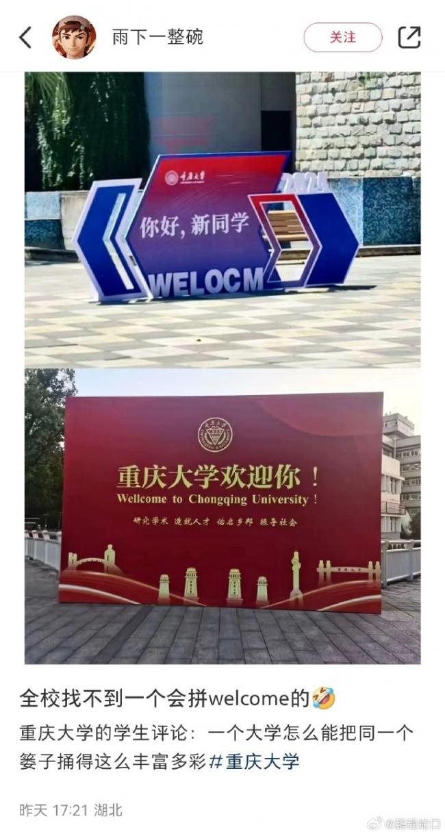 網友評論說:“英文不行也就算了,中文也不行,一所985大學幾萬師生,連最基本的漢字都寫錯,最基本的英語單詞都寫錯,離譜了吧?”“無比尷尬”、“最近巴蜀天兒熱,估計上頭了”。