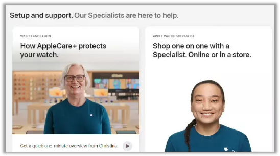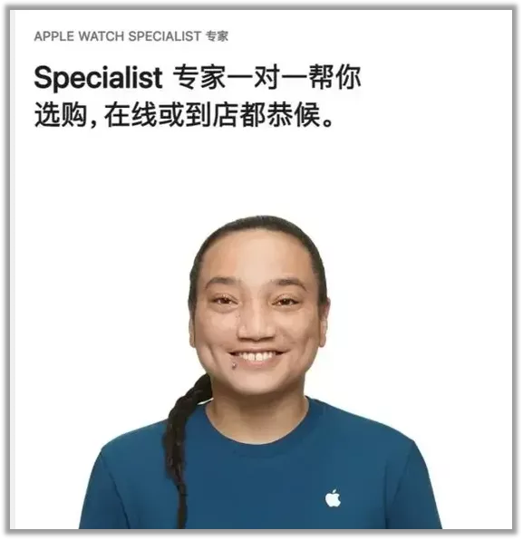 还有一次,苹果发布了新产品。然后他们官网上有个“专家一对一选购”的选项,其中苹果手表的专家,是长这样的: