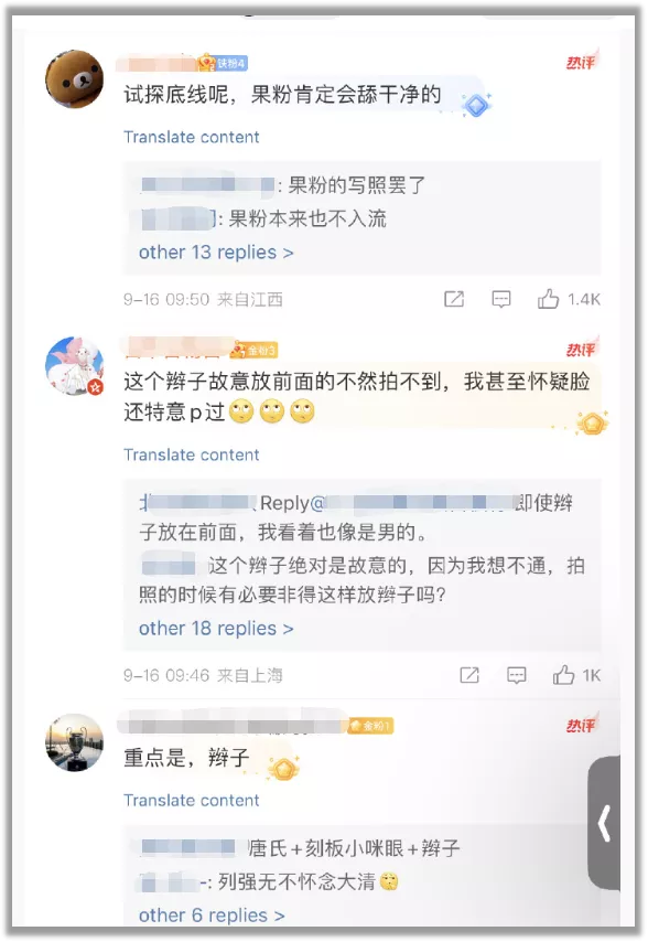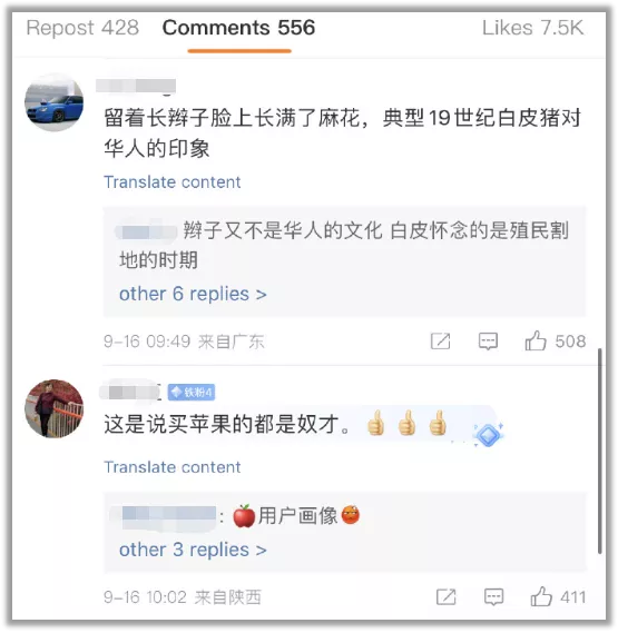 然后一堆大V转发,表示这绝对是刻意歧视中国人。评论则是一片“试探底线”、“苹果用户都是奴才”等声音。