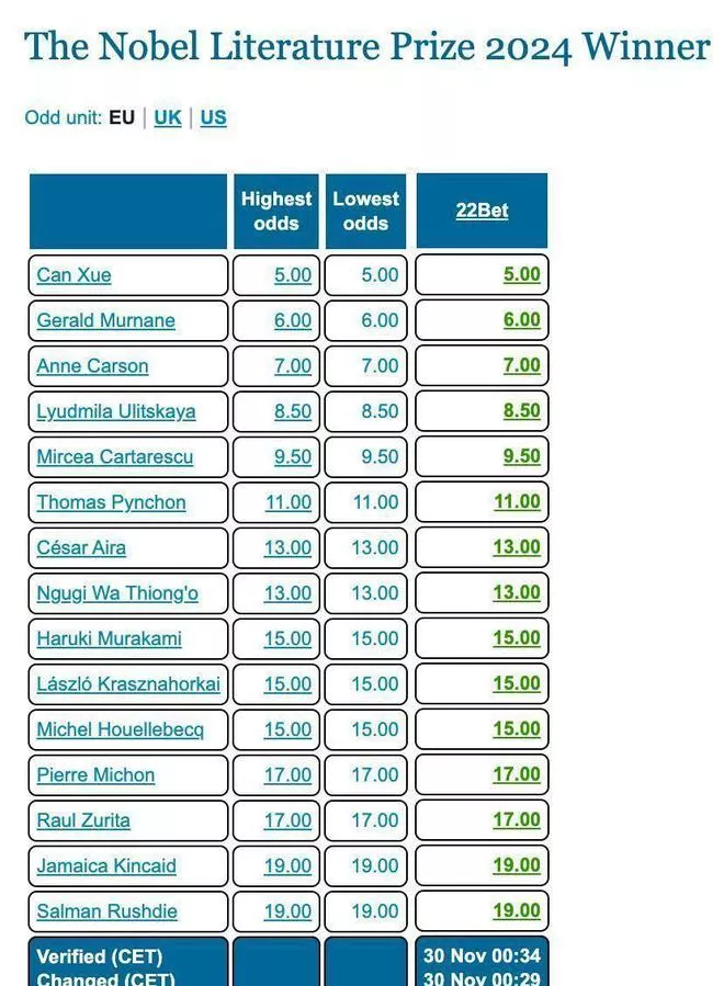 近年来,每当诺贝尔文学奖颁布前夕,世界各大博彩公司都会设立特别团队,他们兼具文学爱好者和精算师的身份,结合评委喜好、作品质量、公众关注度等因素制定出当年的诺奖赔率榜。