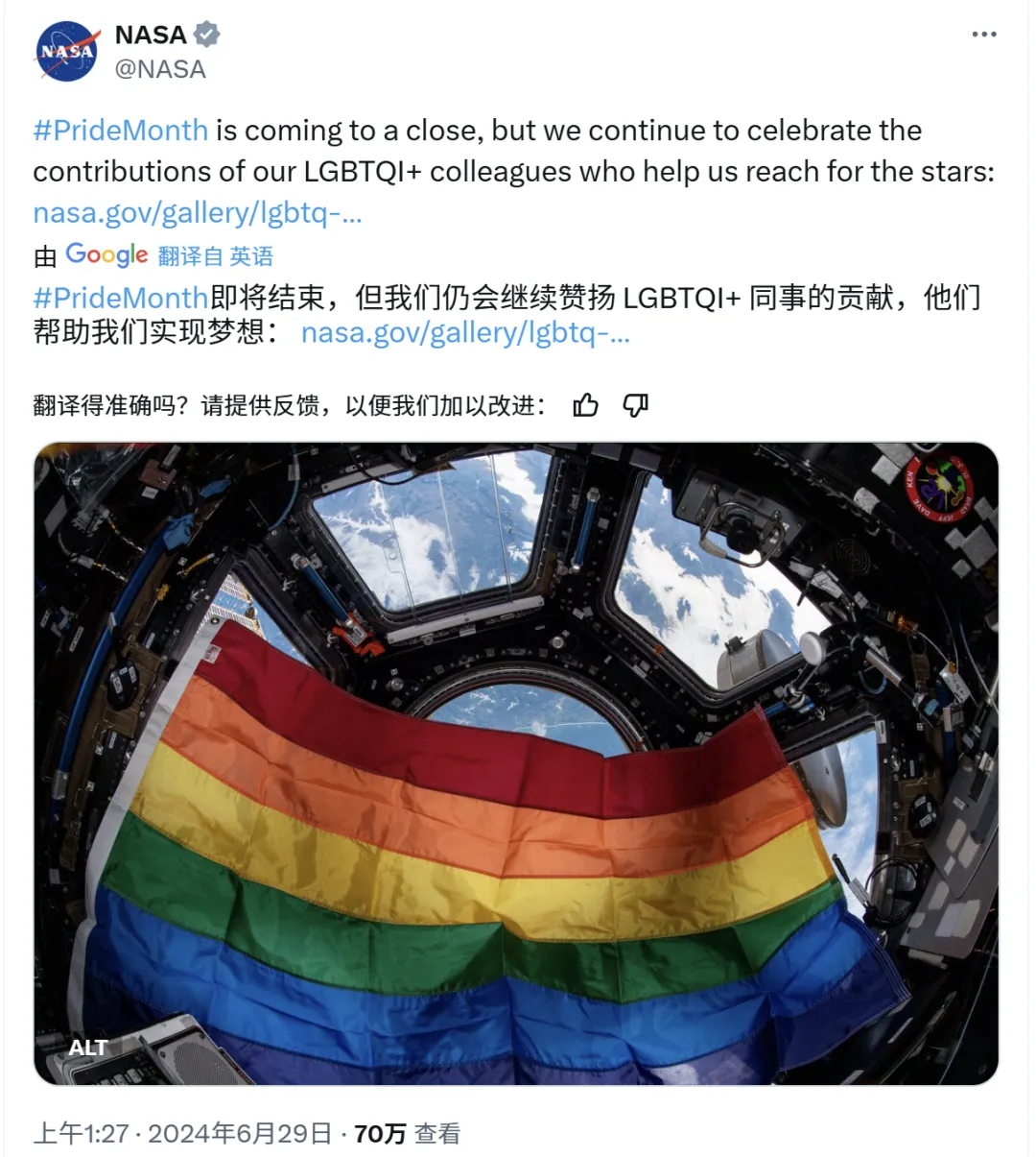 NANS在帖子中發布了一張“驕傲旗幟”在太空飛行器的照片,並配文:我們仍會贊揚LGBTQI+同事的貢獻,他們幫助我們實現夢想。