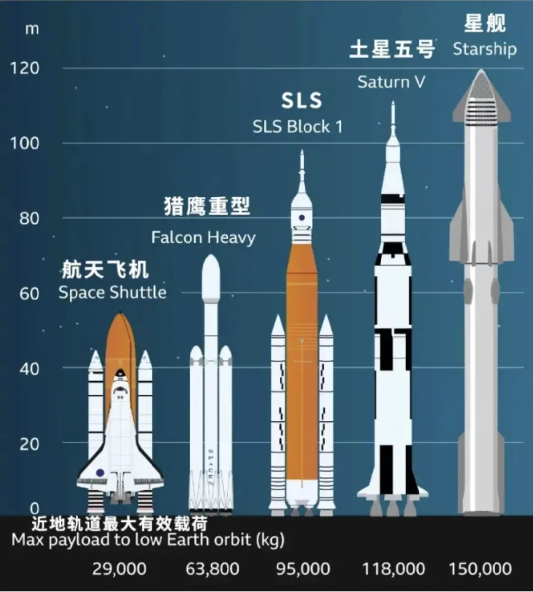 “星艦”系統由“星艦”飛船和“重型”運載火箭組成,為兩級完全可重復使用運載器,直徑9米,高度121米,全箭最大起飛推力7130噸,最大貨物裝載能力達到250噸,設計搭載人類乘客100名。