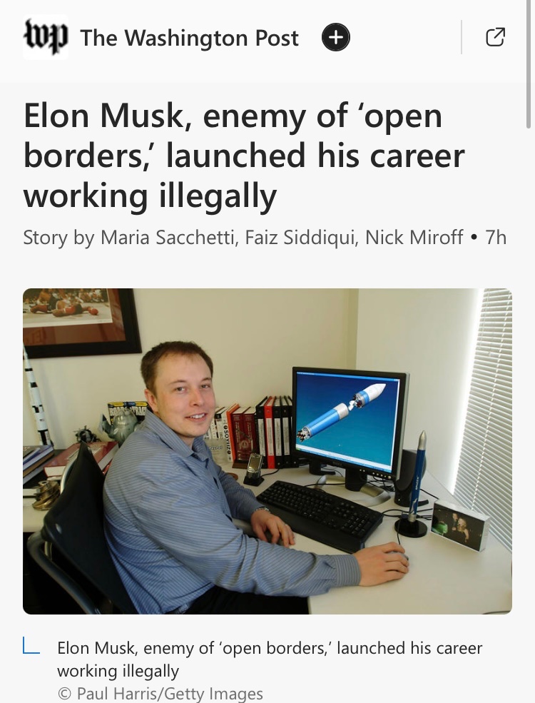 据《华盛顿邮报》报道,马斯克1995年持学生签证来美读研,但没有入学,而是创办了自己的第一家初创公司。报道称,没有注册读研究生课程,意味着他当时在美国的居留是非法的。