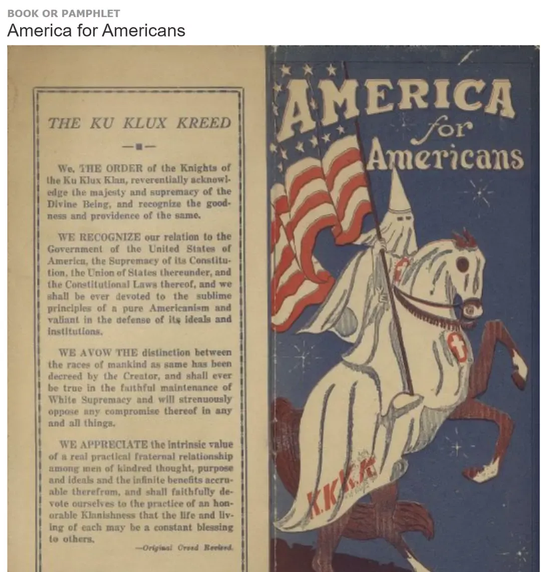 很多人不明就里,说这句话听上去好像没毛病?但是要知道,“美国是给美国人的”,是三K党使用过的口号。其潜台词就是,不是美国人都得滚蛋。在米勒这样一个种族主义者口中的美国人,就是所谓的WASP(白人—盎格鲁撒克逊—清教徒),其他不属于这个群体的人,比如有色人种、少数族裔,都是“非我族类”,也得靠边站。