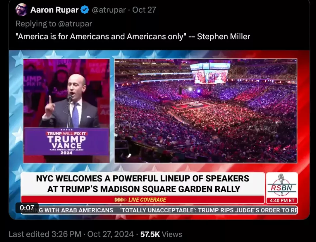 在这场大会上,米勒宣称“美国是给美国人的,且只属于美国人”。这种说法得到了集会观众的热烈响应。