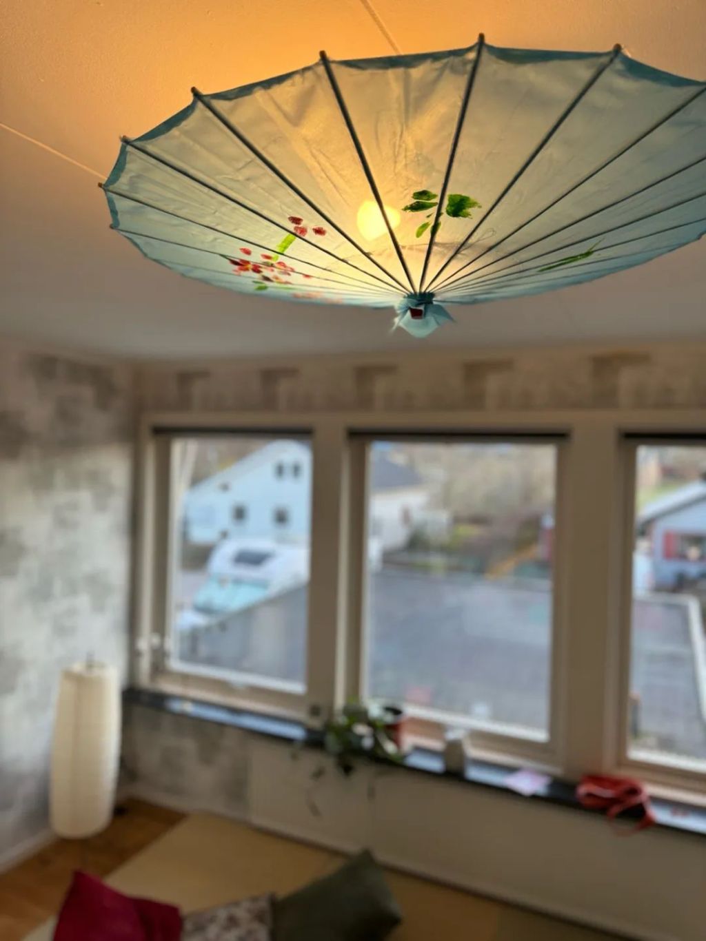 我把榻榻米換了個方向擺放,正對著朝南的窗子。又突然想起爸媽很早以前送小7的中式雨傘,可以舊物利用拿來做個燈罩。