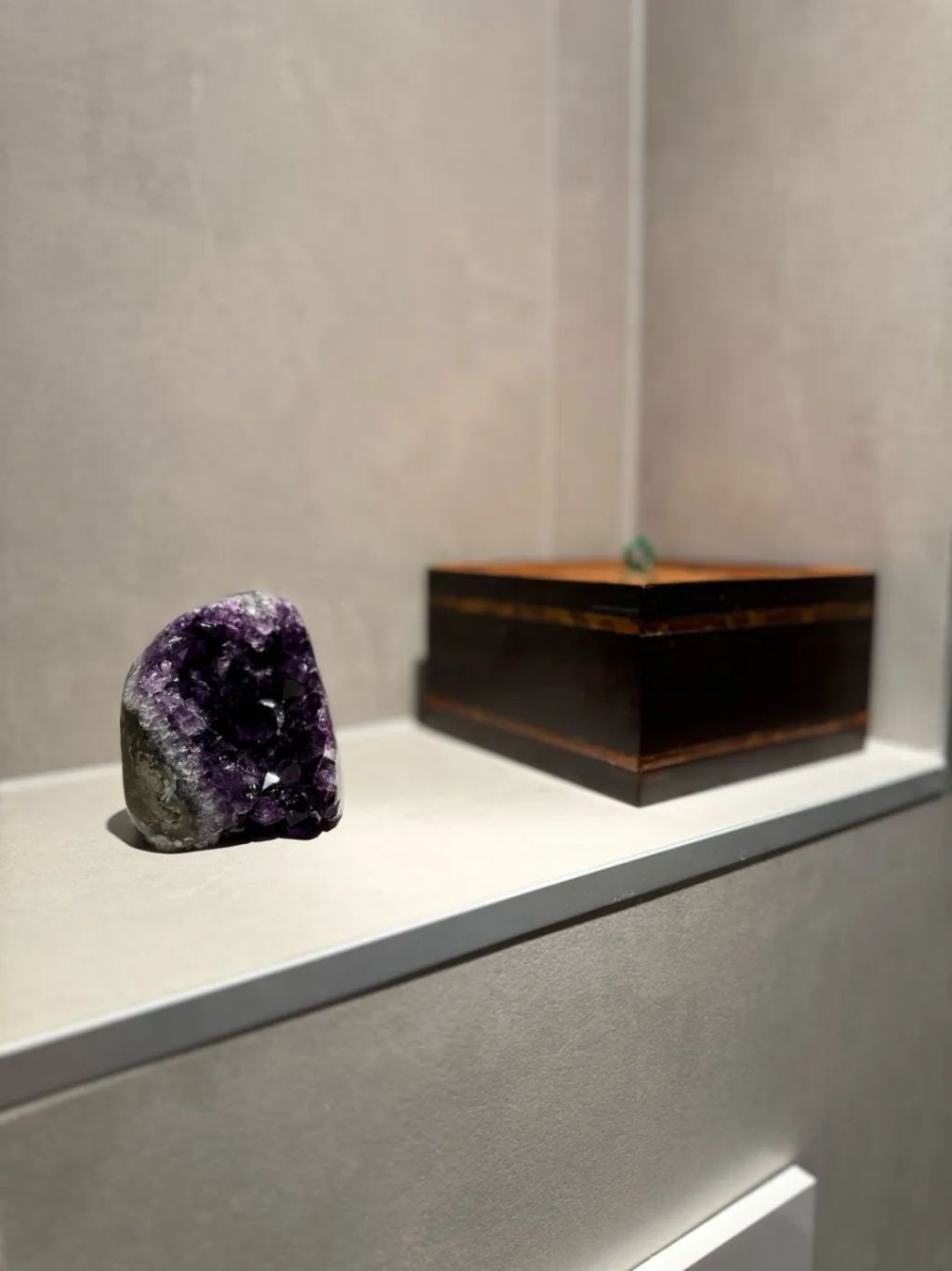 在水泥風台面上,擺上了一坐小小的原石紫水晶,和一個帶著翡翠圓環提手的竹制收納盒,感覺就好多了。