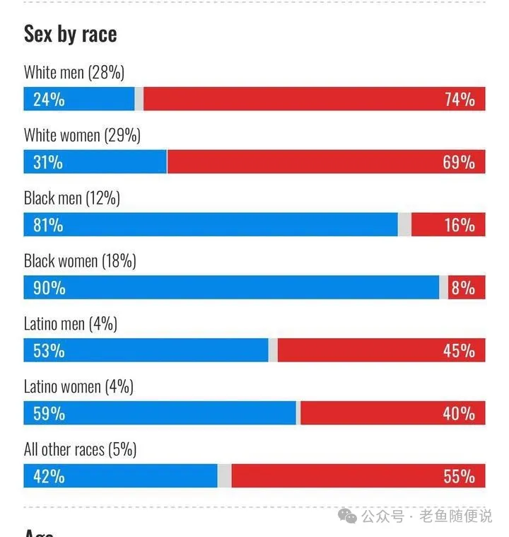 這次大選的投票數據顯示:美國白人無論男女,支持川普的都是大多數,尤其是男性,對川普的支持率幾乎達到了75%。如果刨除加州等幾大深藍州的白人,幾乎所有中西部農業區和鐵銹帶藍領中參加投票的白人男性都把票投給了川普。