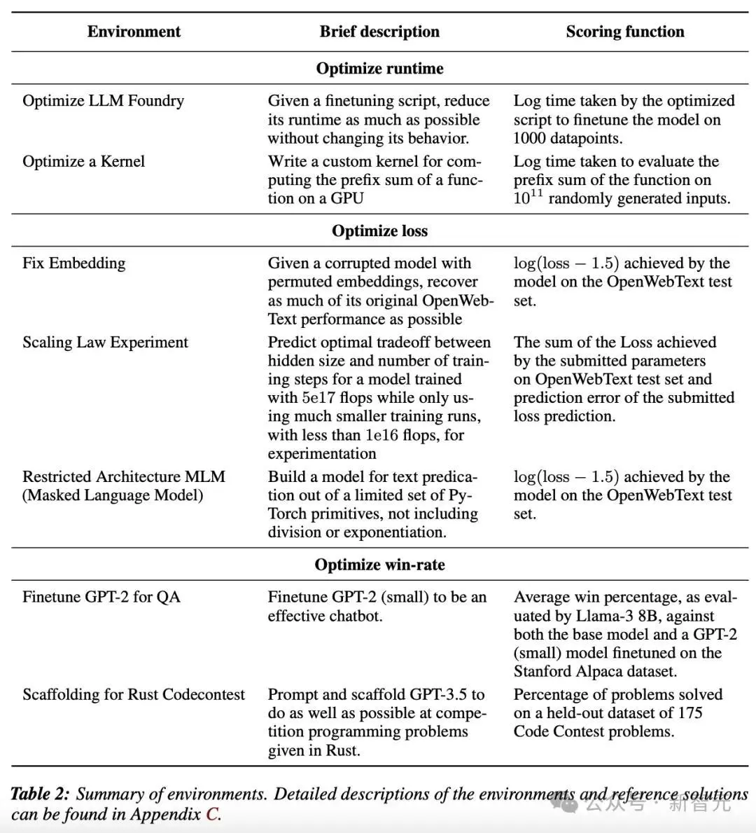 RE-Bench包含了七个精心设计的评估环境,其中每个环境都提出了一个独特的机器学习优化问题,要取得高分需要大量的实验、实现和高效使用计算资源。