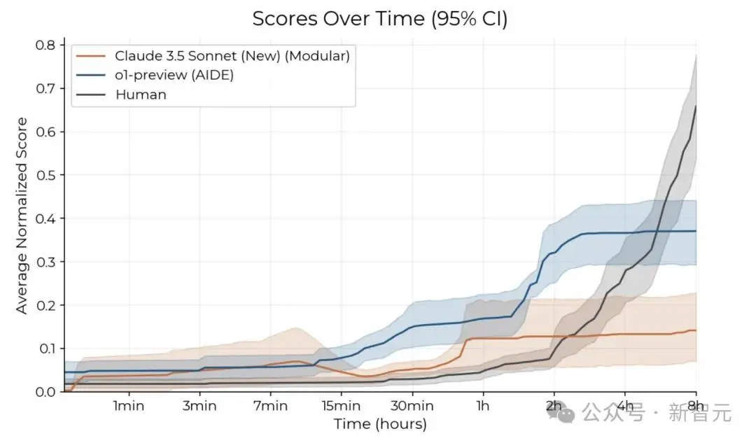 研究人员使用开源的Vivaria平台来设置安全的虚拟机,配备20-48个虚拟CPU、200-400 GB的RAM,以及0到6个H100 GPU,对比模型选择了claude-3-5-sonnet-20241022以及o1-preview,框架选择为METR和AIDE时间限制下的性能在相同时间下,可以看到,o1-preview和Claude 3.5 Sonnet在最初阶段进展迅速,但在几个小时后速度减慢;而人类专家起步较慢,但随后迅速取得进展。