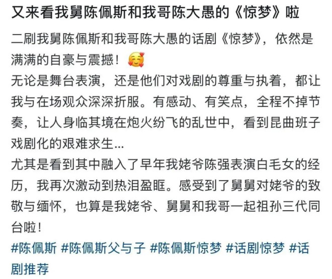 此次合影的背景,是陈佩斯与陈大愚在全国话剧《惊梦》的巡演期间,陈丽达特意前来支持哥哥的演出,兄妹俩的深厚感情由此可见一斑。