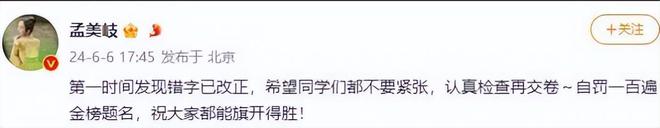在意识到错误后,孟美岐迅速采取了补救措施,不仅立即更正了错别字,还主动惩罚自己手写“金榜题名”一百遍。