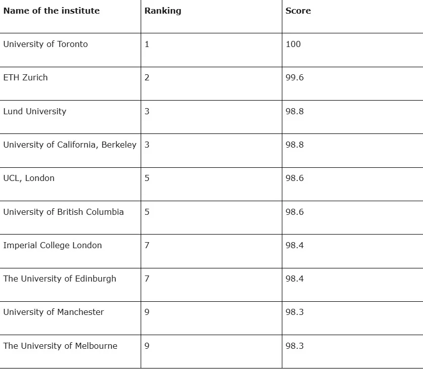 该排名考虑了来自 100 多个地区的 1,700 多所世界大学。美国有 239 所大学上榜,新西兰的 8 所大学平均得分最高。加拿大是唯一有两所院校跻身前五名的国家。
