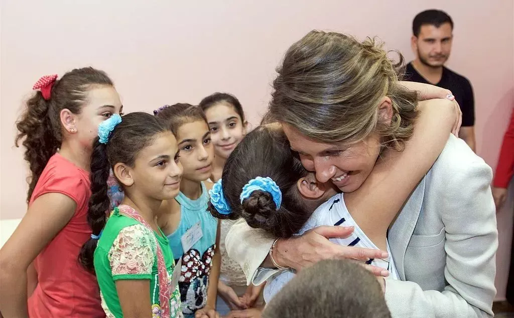 當地時間2017年9月7日,敘利亞塔爾圖斯,9月開學季,阿斯瑪去探望身亡士兵的子女就讀的學校。