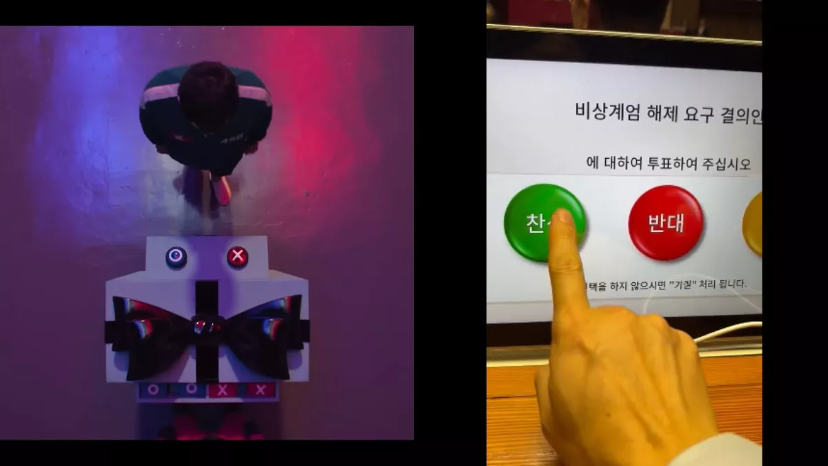韩媒认为,有关场面与190名国会议员就“要求解除紧急戒严令”进行投票的情况相似。在《鱿鱼游戏》第二季,玩家是选择按下“X”或“O”来决定是否要结束比赛,而在现实世界,国会议员也是选择按下红色、绿色或是黄色按钮,来投票决定赞成、反对或弃权“要求解除紧急戒严令”。