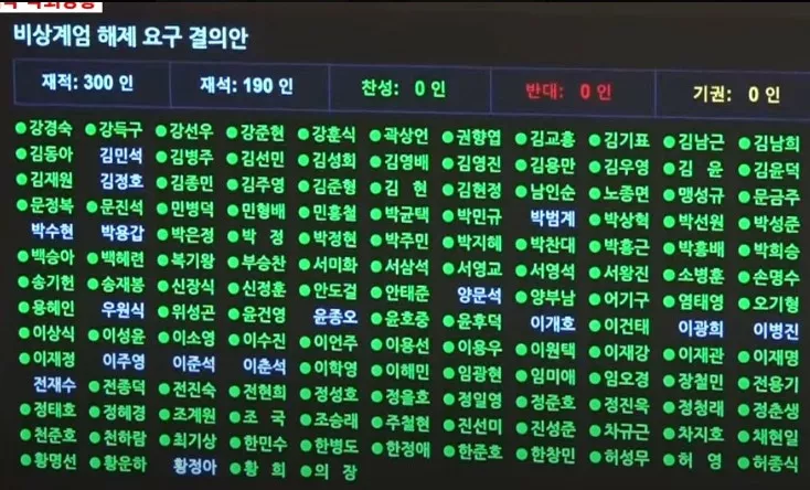 韩国会2024年12月4日凌晨举行紧急全体会议,就“要求解除紧急戒严令”进行投票,出席会议的190名议员全数投下赞成票。(X@FeatherSol)