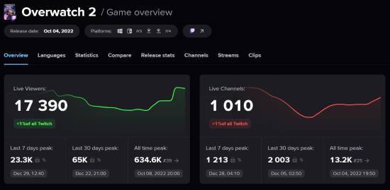 根据Streamscharts的数据,《守望先锋》的平均观看人数由11月的2.8万下降至12月的2.4万,峰值也从12.5万下降到6.4万。若不是12月的Twitch掉宝活动,这一峰值可能还会更低。