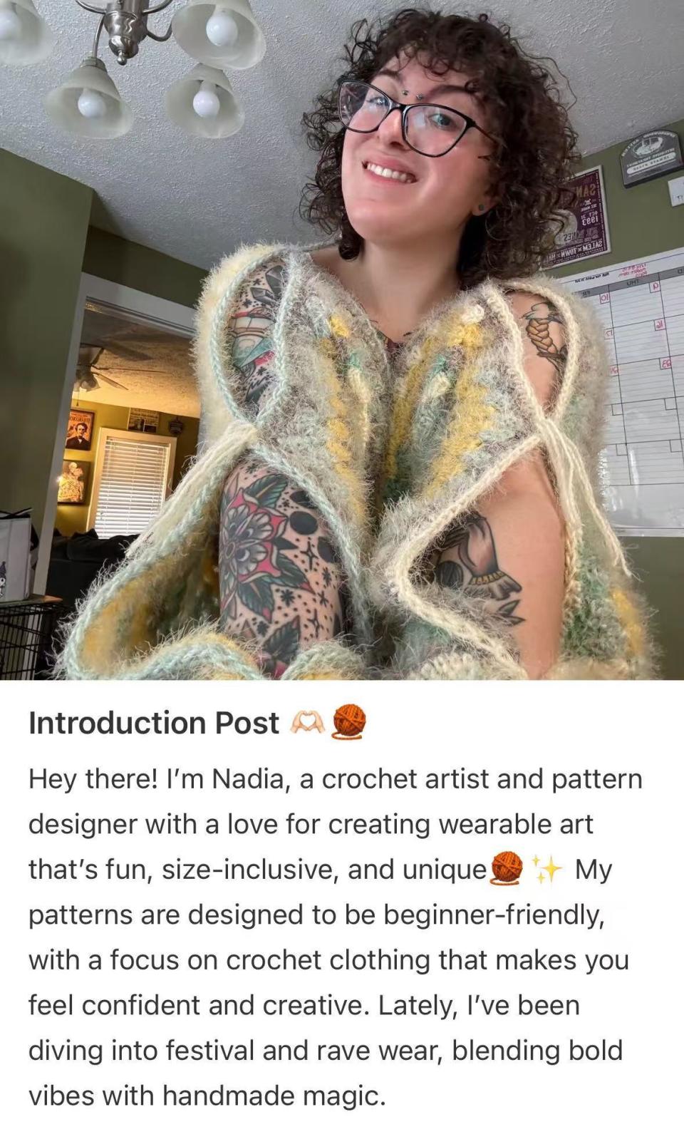 Nadia便是其中之一,從前幾年學習至今,她自稱自己為鉤針藝術家和圖案設計師。“我的圖案是為初學者設計的,重點是鉤針服裝。我熱愛創造有趣的、包容性高的以及獨特的針織服飾,無論你是在尋找圖案或者靈感,歡迎和我一起產生有趣的鉤針共鳴。”在小紅書主頁上,Nadia這樣介紹自己。