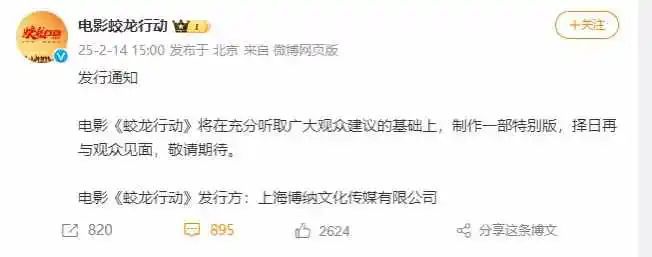 就在2月14日,《蛟龙行动》官方微博发布消息称,将制作特别版择日与观众见面,这实际上已经相当于撤档。