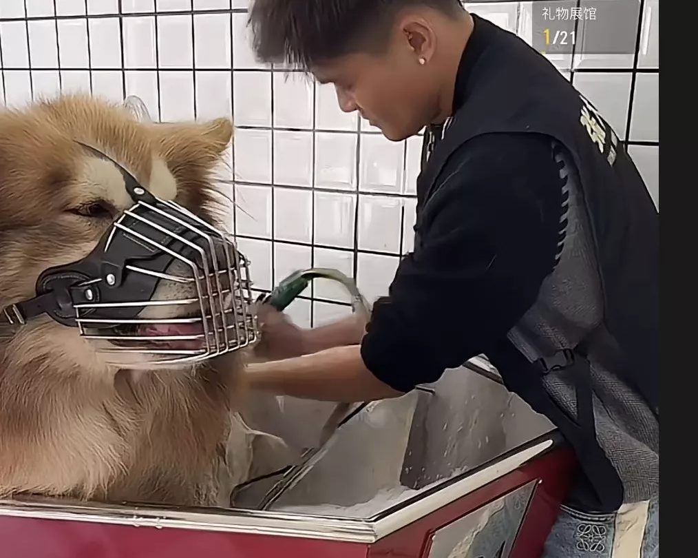 更有冲击力画面的是什么?是如今的潘宏浑身上下名牌,却不给狗用20块钱的大型犬洗澡口嚼子,从直播画面来看,他们此时就在专门洗狗的宠物店,你能想象店里没有口嚼子却有数条勒死狗吗?