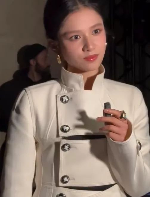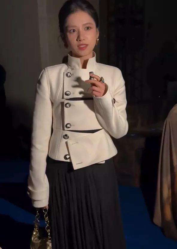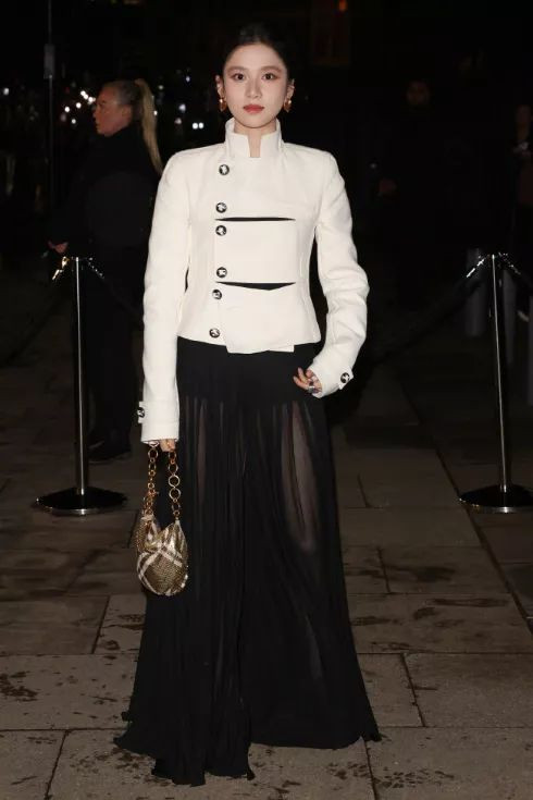同时,她身上的白色双排夹克,搭配下半身的黑色褶裥半裙,也减弱了因为年龄太小而产生的青涩感,看上去飒爽霸气,更有气场了。