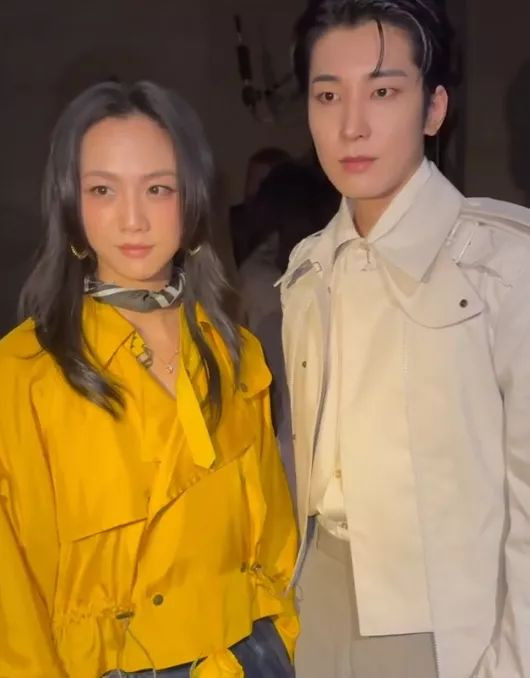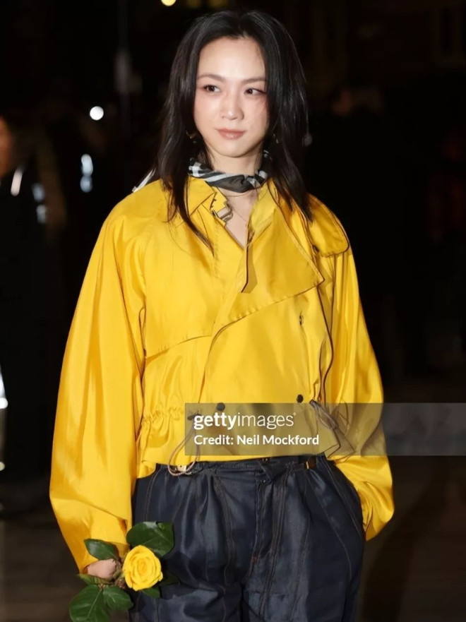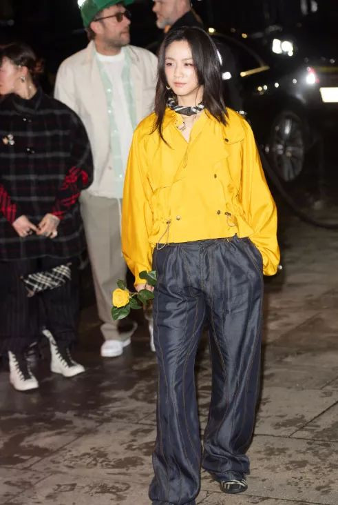 亮黄色短款风衣搭配灰色休闲长裤,松松垮垮的造型放在普通人身上,可能就像是要去下地干活。
