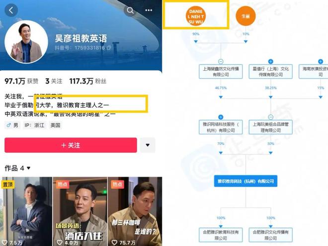 “雅识教育主理人之一”是“吴彦祖教英语”账号简历上公开标注的title(职位)。据企查查数据,雅识教育科技(杭州)有限公司由上海玩美祖合品牌管理有限公司持股30%,后者又由上海斐鑫然文化传播有限公司持股46.75%,而DANIEL NEH TSU WU(即吴彦祖)则持有上海斐鑫然文化传播有限公司高达90%的股权——这也意味着,吴彦祖与该教培机构有着明显的股份权益关系。