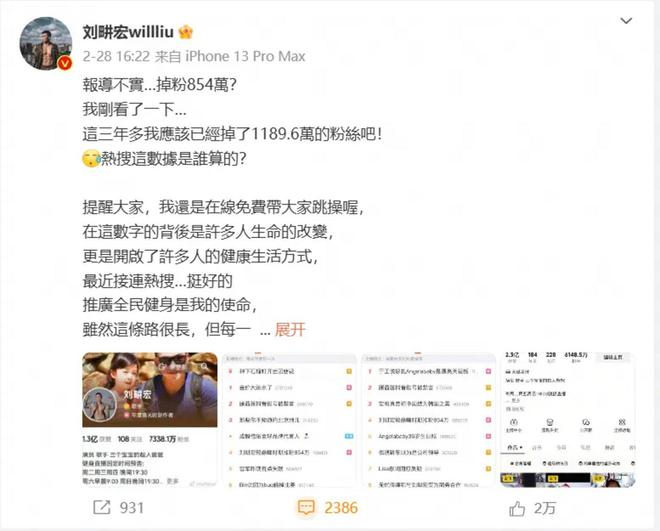(刘畊宏称自己三年掉了近1200万粉丝,图源微博)