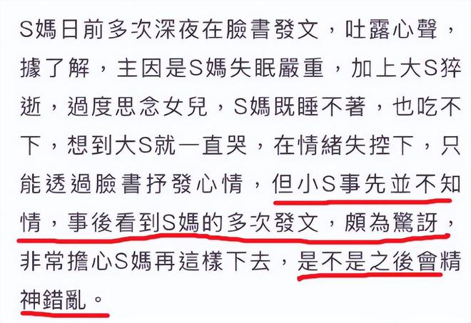 小S对此颇为惊讶,称自己事后才看到了妈妈的多次发文,事先并不知情,也不知道妈妈会半夜失眠,甚至还担心她再这样子下去,之后会不会精神错乱。