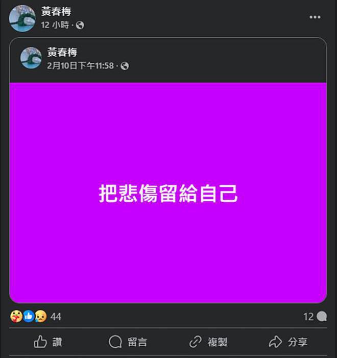 小S目前仍旧处于悲痛之中,S妈黄春梅通过个人账号先后13次发文表达对大S的追思之情。