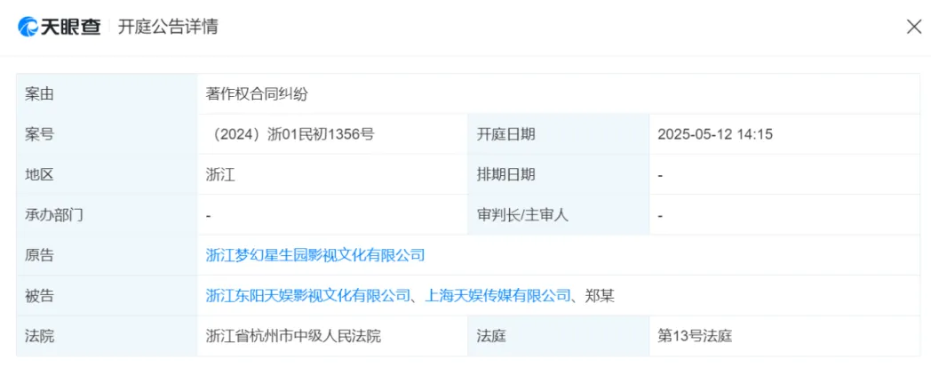 根据天眼查平台最新法律诉讼信息披露,浙江省杭州市中级人民法院近日发布公告,向郑爽送达浙江梦幻星生园影视文化有限公司诉其与浙江东阳天娱影视文化有限公司、上海天娱传媒有限公司著作权合同纠纷一案的法律文书。据悉,原告方浙江梦幻星生园影视文化有限公司曾出品由郑爽主演的《寂寞空庭春欲晚》《偏偏喜欢你》《抓住彩虹的男人》等影视作品。公告显示,自发布之日起满60日即视为有效送达,并定于2025年5月12日开庭审理。