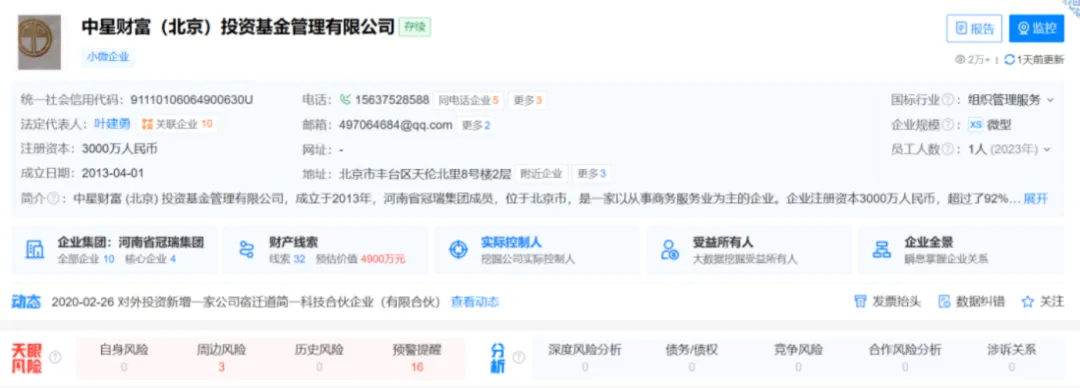叶延伟,河南新财富集团核心成员,涉嫌在2022年村镇银行暴雷案中卷走400亿储户存款,被列为国际刑警组织红色通报在逃人员。这位逃亡美国的通缉犯,通过中星财富等壳公司构建起横跨金融、科技的地下帝国,其控制的企业涉及私募、影视投资等领域,仅中星财富注册资本就达3000万元。
