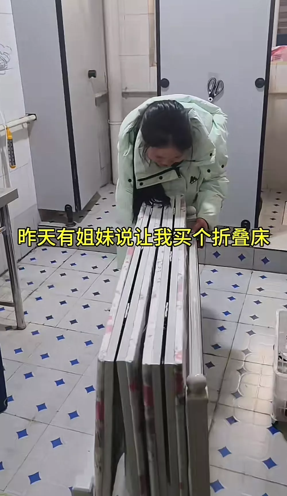 有网友建议她住在展厅里,阳女士说展厅太空旷,她害怕,公司也有办公室,但是没有门,她担心不安全。阳女士买了一张折叠床,白天放在卫生间门口,晚上搬进卫生间,将床展开后正好抵住卫生间的门。