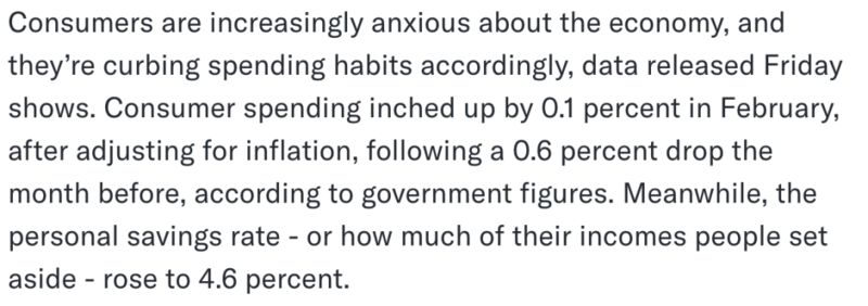 政府數據顯示,2 月份消費者支出在扣除通貨膨脹因素後小幅上漲 0.1%,而上個月則下降了 0.6%。與此同時,個人儲蓄率上升至 4.6%。