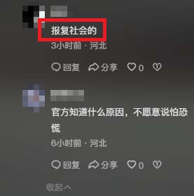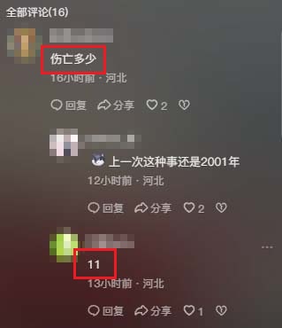 在大陆抖音平台上,还有多个未被删除的当地网民评论,都称此事是有人“报复社会”。还有一名当地网民回答其他网友的提问称,这次爆炸共伤亡“11”人。
