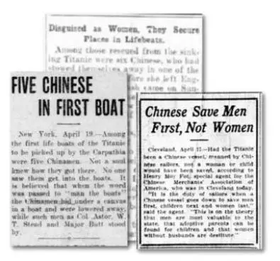 这六名中国人,在沉船时用披肩假扮成女性,在船员高喊“女性优先”的时候,混入救生艇从而得以幸存。……他们中的一个甚至还试图剥下一名乘客的救生衣。