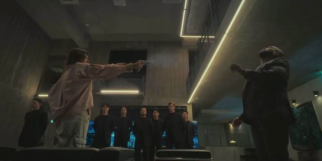 當他西裝筆挺地給流浪漢發槍時,仿佛在派發慈善午餐,彈幕瘋狂刷屏:三觀跟著五官跑。兩人巷戰戲堪稱藝術:金南佶戰術翻滾帥出天際,金英光優雅閃避如同跳探戈。