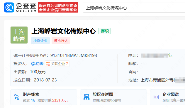 其中,上海峰岩文化传媒中心成立于2018年,由李易峰个人出资。