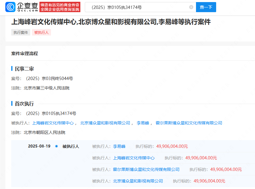 李易峰与其公司等被强制执行4990万。企查查App显示,8月19日,李易峰上海峰岩文化传媒中心、北京博众星和影视有限公司等被北京市朝阳区人民法院强制执行约4990万元。