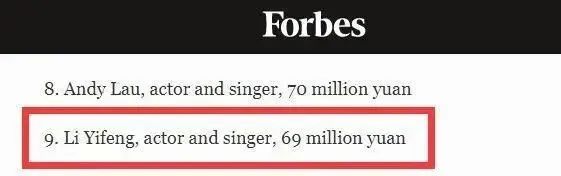 据此前报道,李易峰曾多次登上福布斯中国名人榜。而在2015年福布斯中国名人榜中,李易峰凭借6900万元年收入排名第九。