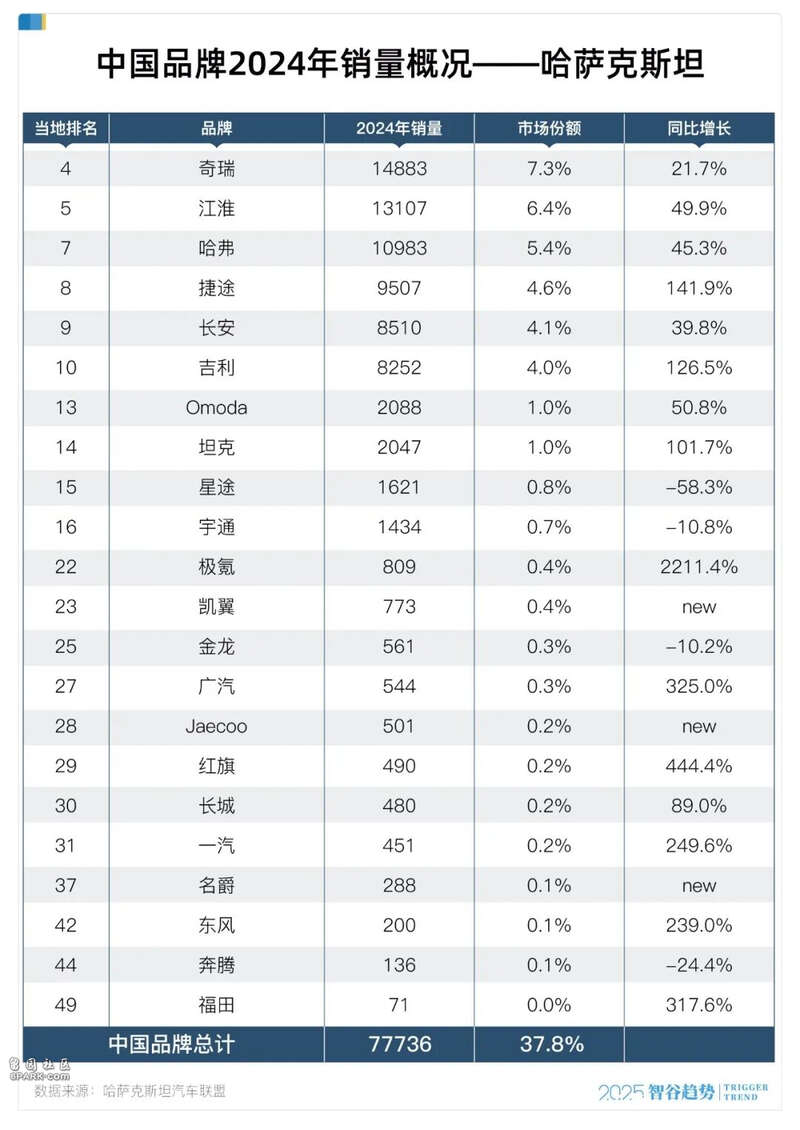 国产汽车品牌,奇瑞、江淮、长城、长安、吉利等车企,早在二十多年就进入了中亚市场,已经成了中亚的全民品牌。2024年,奇瑞、江淮、长城哈弗分别在哈萨克斯坦卖出14883、13107、10983台,市场份额分别为7.3%、6.4%、5.4%。