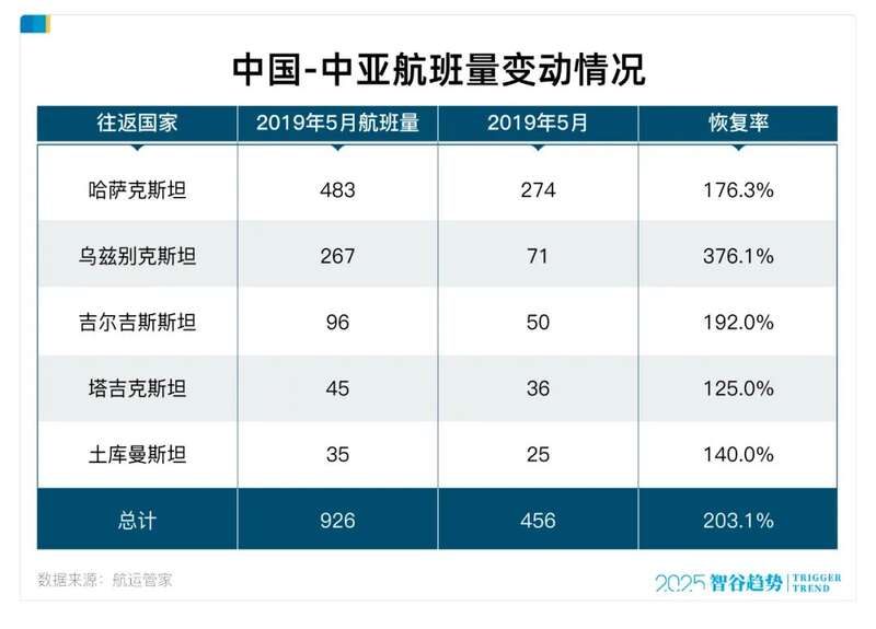 对比2019年,中欧、中美航班冷清了,但中国中亚的航班量却越来越密集,逆势增长了103.1%。
