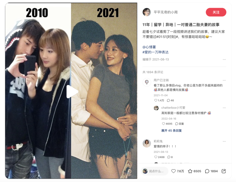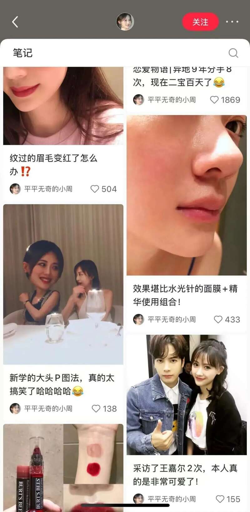 生活Vlog博主@平平無奇的小周 在小紅書上有29.4萬粉絲。她的置頂是一條和老公的相愛故事,絮絮叨叨講他們是怎麼認識的、第一次過生日、第一個情人節、第一個小狗、第一個孩子、第二個孩子。