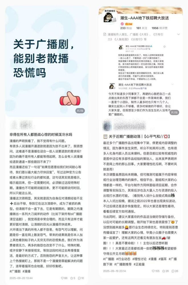 早在2022年,廣播劇平台就曾面臨過耽美廣播劇大規模下架的危機,當時下架的作品中不少已獲得影視改編授權。與2022年相比,此次事件顯示出一些新特點:平台反應更加迅速,很快就出台了補償方案;用戶反應也更為理性,雖然有不少陰謀論,但更多用戶表示理解並願意等待內容恢復。