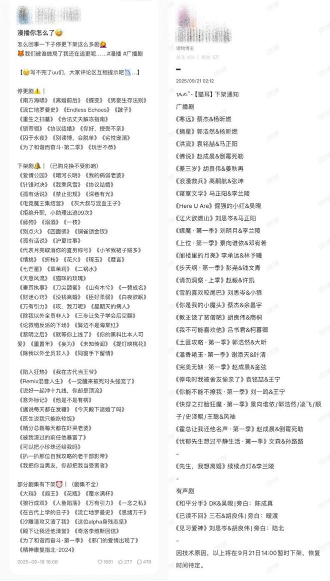 此次漫播廣播劇下架事件波及作品范圍廣泛,根據網友整理的詳細清單,受影響作品可分為三個類別:完全停更劇、全面下架劇以及部分下架劇。停更劇列表包括《南方海嘯》《離婚前後》《蝶變》《男妾生存法則》《流亡地羅曼史》《EndlessEchoes》《跛跛子》等20余部作品,這些作品突然停止更新,讓許多追更用戶感到措手不及。