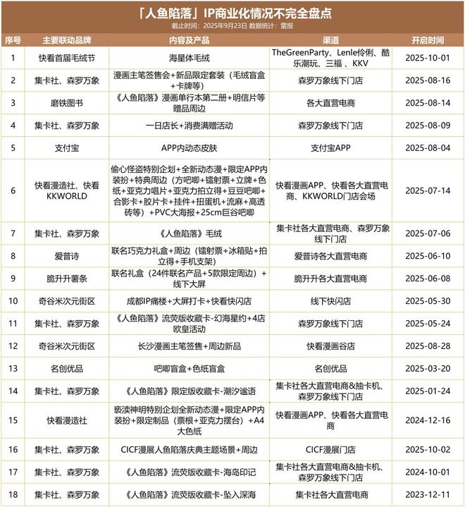 但客觀來看,以《人魚陷落》為代表的IP商業化成功,主要依托的是快看漫畫平台在漫畫內容持續更新,以及多樣化實體衍生品開發的協同運作。其衍生體系覆蓋從線下零售渠道到限定收藏品的多層次消費場景,已形成不依賴單一內容形式的穩健商業模式。