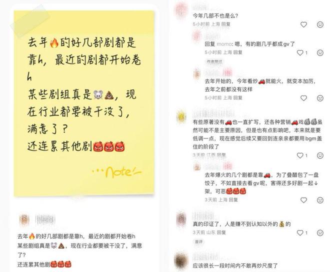 在這種監管環境下,商業化需求與內容合規之間的張力愈發明顯。網友普遍反映“去年爆火的幾個劇都是靠h(親密戲),最近的劇都開始卷h”,直指部分制作方為追求商業利益過度擴展敏感內容,“有些原著沒有車,(改編劇)也一直擴寫,還各種營銷車戲”。