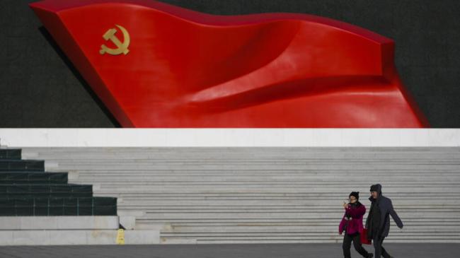 2025年1月,人們走過位於北京中國共產黨歷史展覽館前的中共黨旗雕塑。 © 美聯社圖片