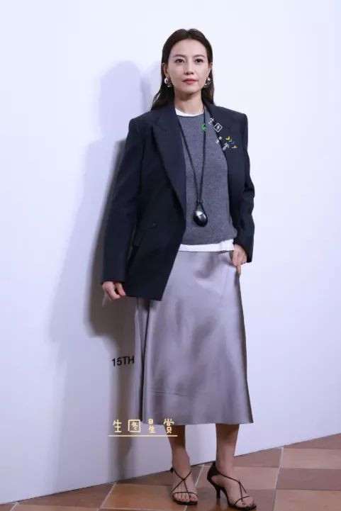 灰白叠穿的上衣搭配西装外套并不会显得太过厚重,下半身银灰色的缎面长裙质感更是不俗,抢眼的项链让高圆圆的气质更加的端庄。